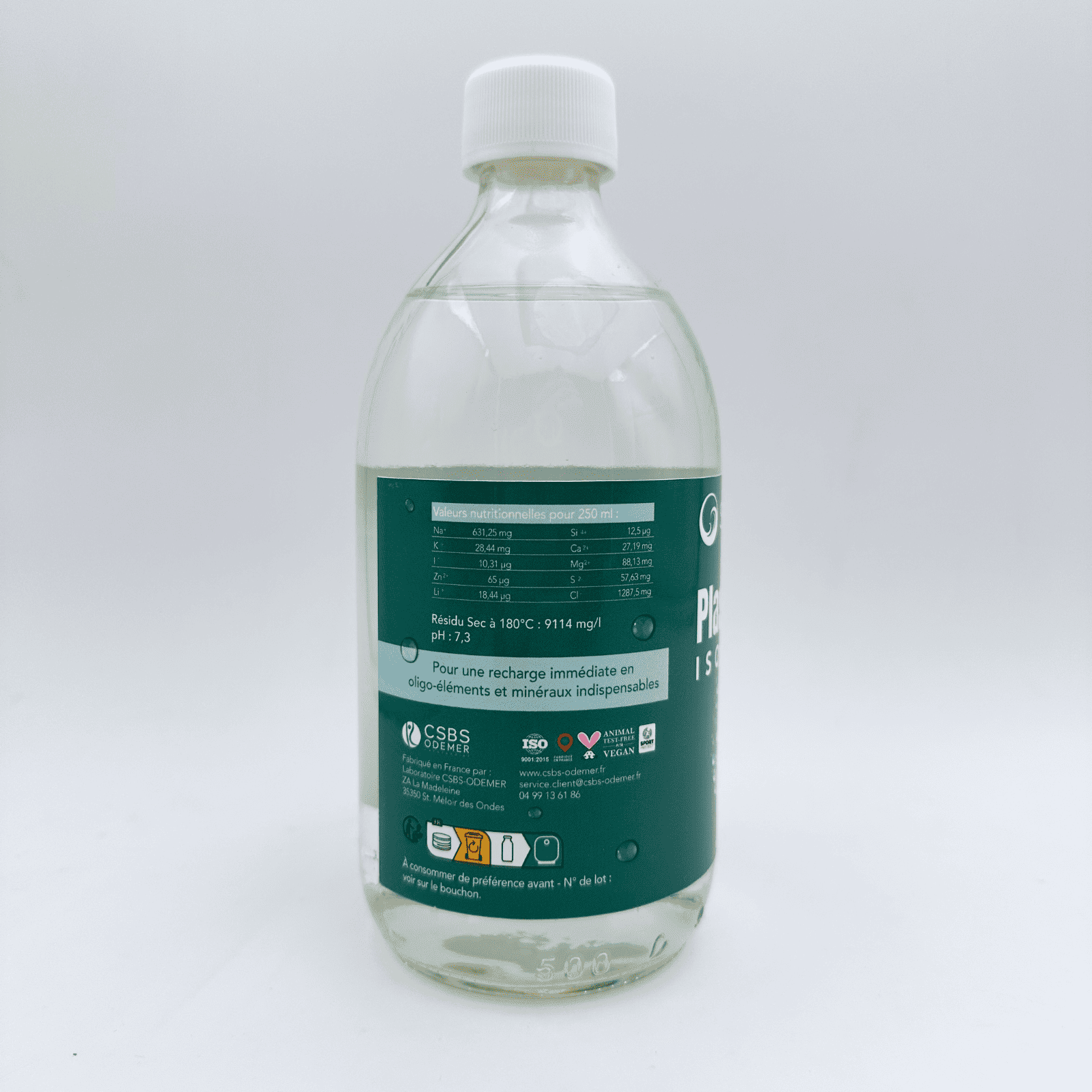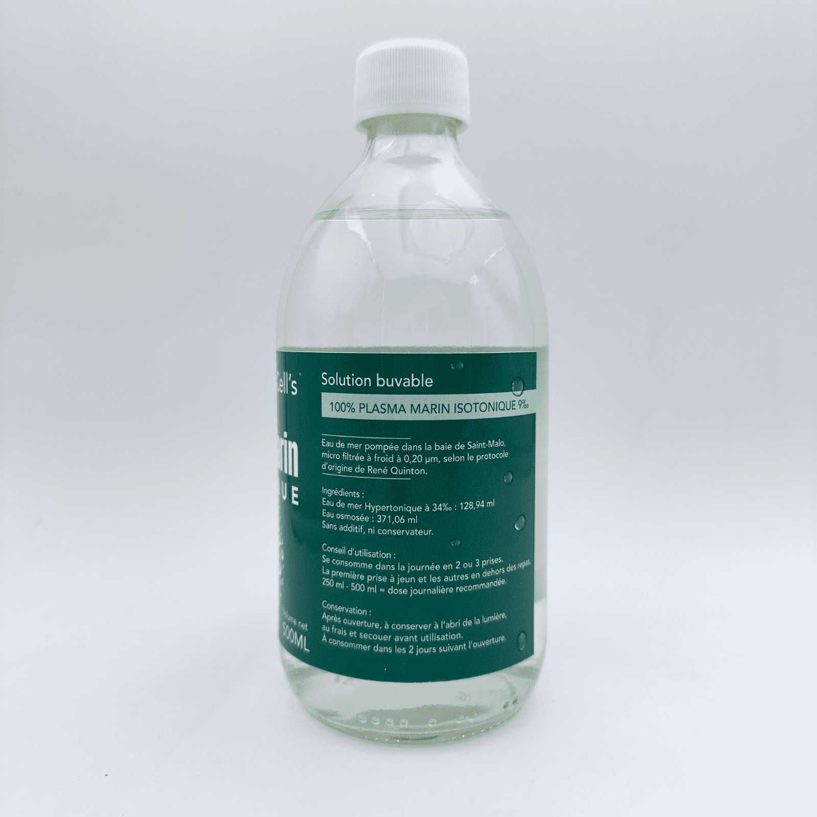 Plasma marin isotonique 500ml : eau de mer pompée en Bretagne, 100% française, microfiltrée à froid (0,20 µm) selon le protocole René Quinton. Format professionnel.